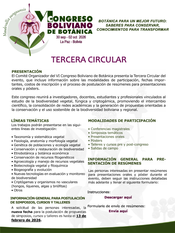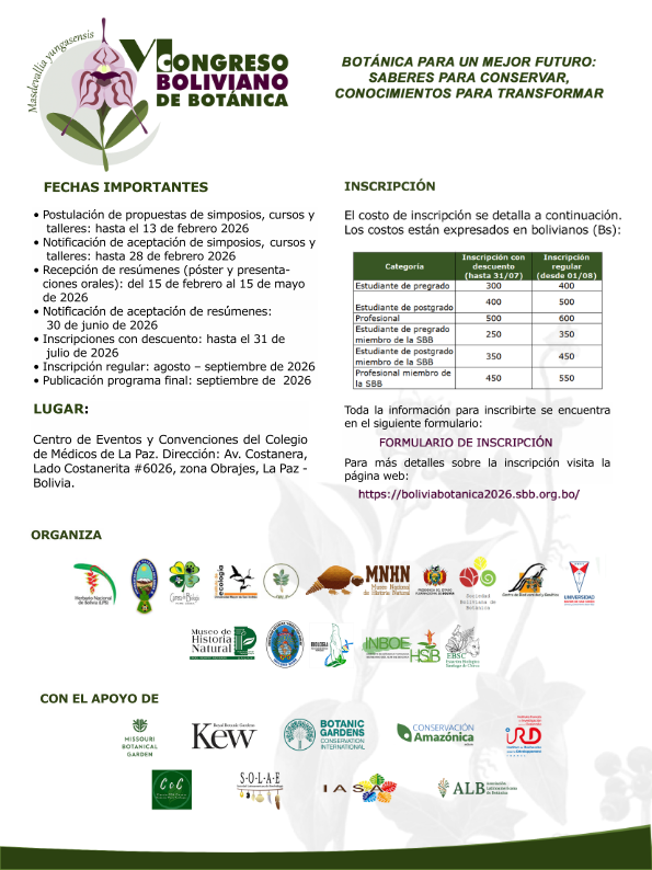 El Herbario Nacional de Bolivia (LPB), junto al Instituto de Ecología (IE) de la Universidad Mayor de San Andrés (UMSA), la Carrera de Biología, el Museo Nacional de Historia Natural (MNHN), la Sociedad Boliviana de Botánica (SBB) y otras instituciones aliadas, invitan cordialmente a investigadores, estudiantes y público en general a participar de este importante evento. Será un espacio para compartir experiencias, investigaciones y propuestas sobre la flora boliviana y promover su estudio, conservación y uso sostenible.